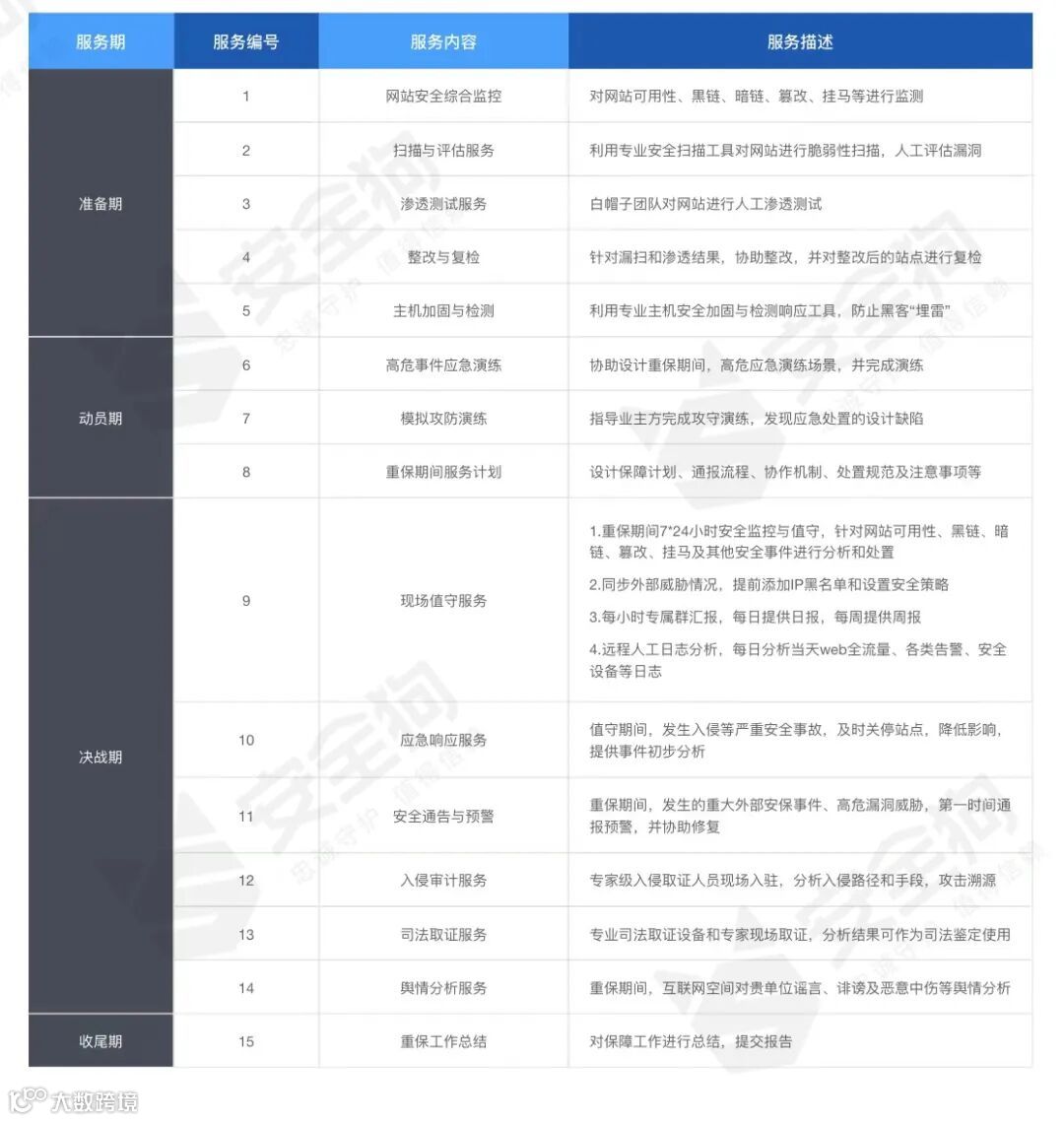 安全狗从多个维度整合了多套方案与服务,对于处于不同重保准备阶段、有不同预算的用户都可根据自身需求灵活调配。