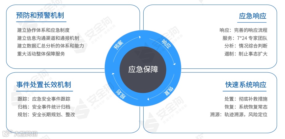 在重要敏感时期,安全狗重保支撑服务通过一站式的产品及专业的安全服务,从网络层面、服务器层面、数据层面为用户构建全方面的重要敏感时期的安全保障。一方面,作为传统硬件防火墙边界防护的有效补充和增强。另外一方面,在重要敏感时期提升用户监测发现、安全防护和应急处置的能力,发现并整改网络系统存在的深层次安全问题。从而进一步以防攻击、防破坏、防泄密、防重大故障为重点,构建多层次多方面的安全防护体系。