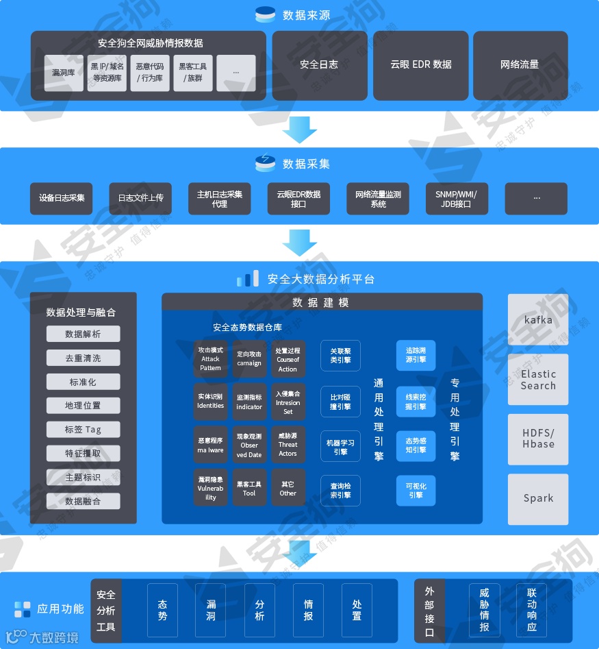 安全狗啸天态势感知平台由安全大数据中台、纵深联动响应与自动化编排引擎、云工作负载保护平台(CWPP)探针、网络流量分析(NTA)探针和日志探针组成,具备集采集、监测、溯源、响应和预防于一体的新一代网络安全智能分析与联动处置平台。