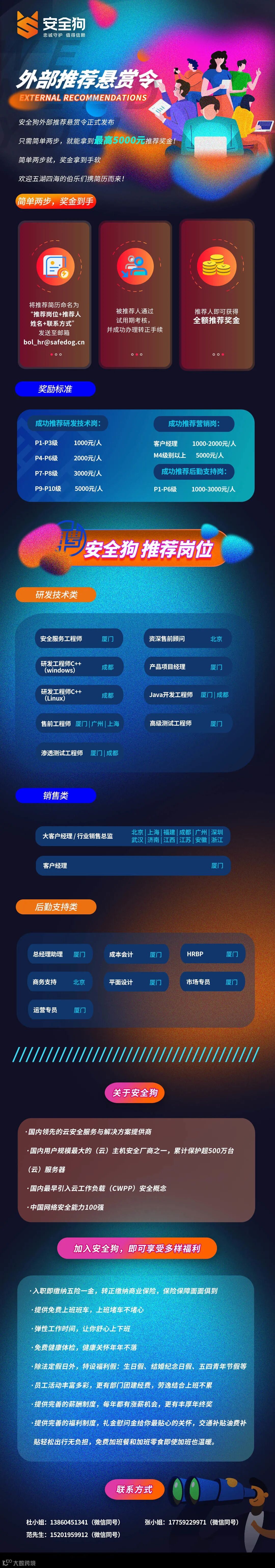 在技术创新上,安全狗一直深知网络安全行业需与层出不穷且千变万化的安全威胁与攻击行为做抗争。安全狗海青实验室和观鸿实验室两大研究部门集结了国内安全行业一线资深研究专家,从事一系列前沿技术的研究,不仅为安全狗的产品和技术创新探索新方向和可能性,也引领着安全狗持续走在安全技术的前沿。