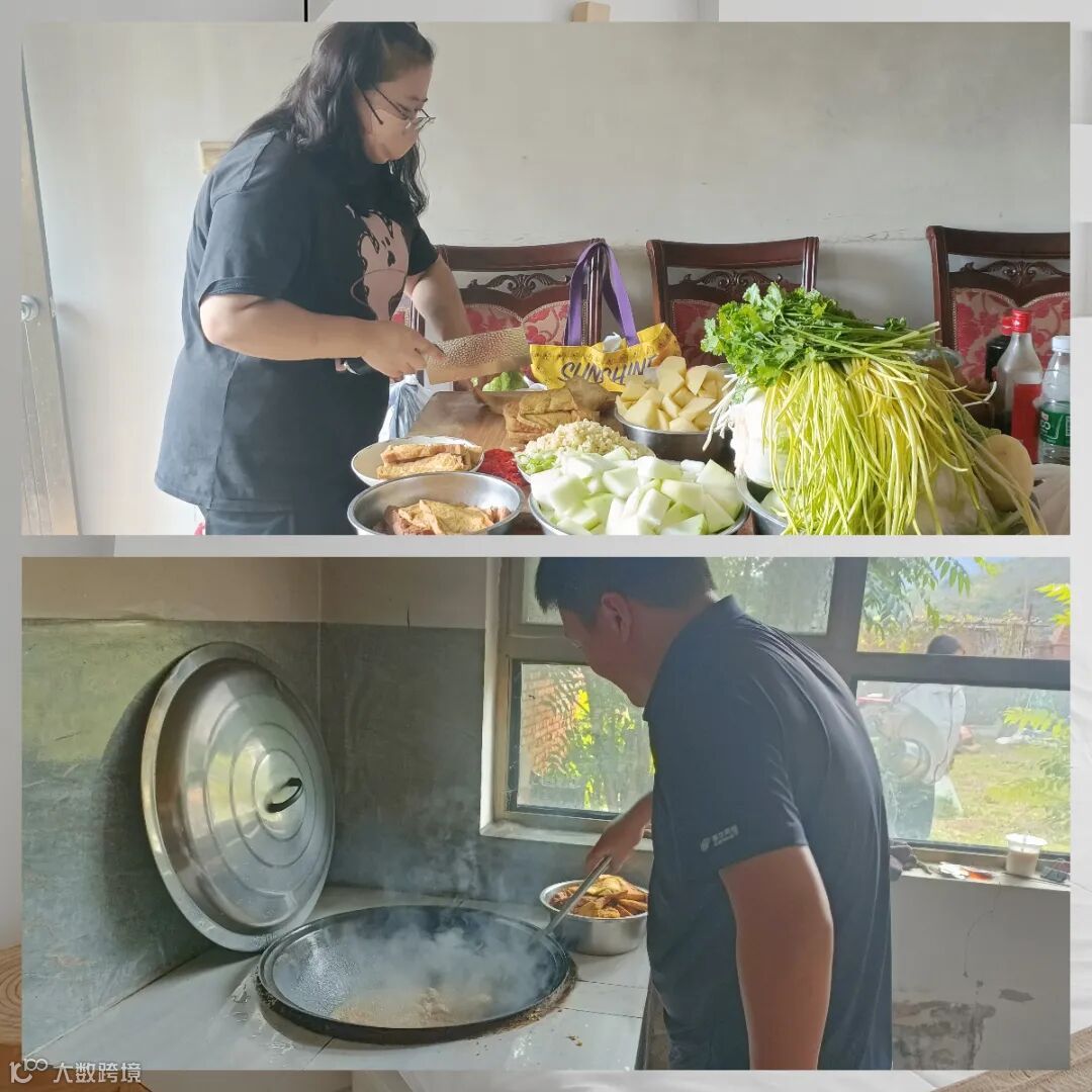 中午12点半,焦总和小伙伴们带着丰收的果实回到农家小院,后勤的小伙伴早已做好了香喷喷的柴火饭等待着大家满载而归。吃饱喝足,在院子里一坐,四周青山,清新凉爽的小风拂过脸庞,是那么的惬意和舒心。