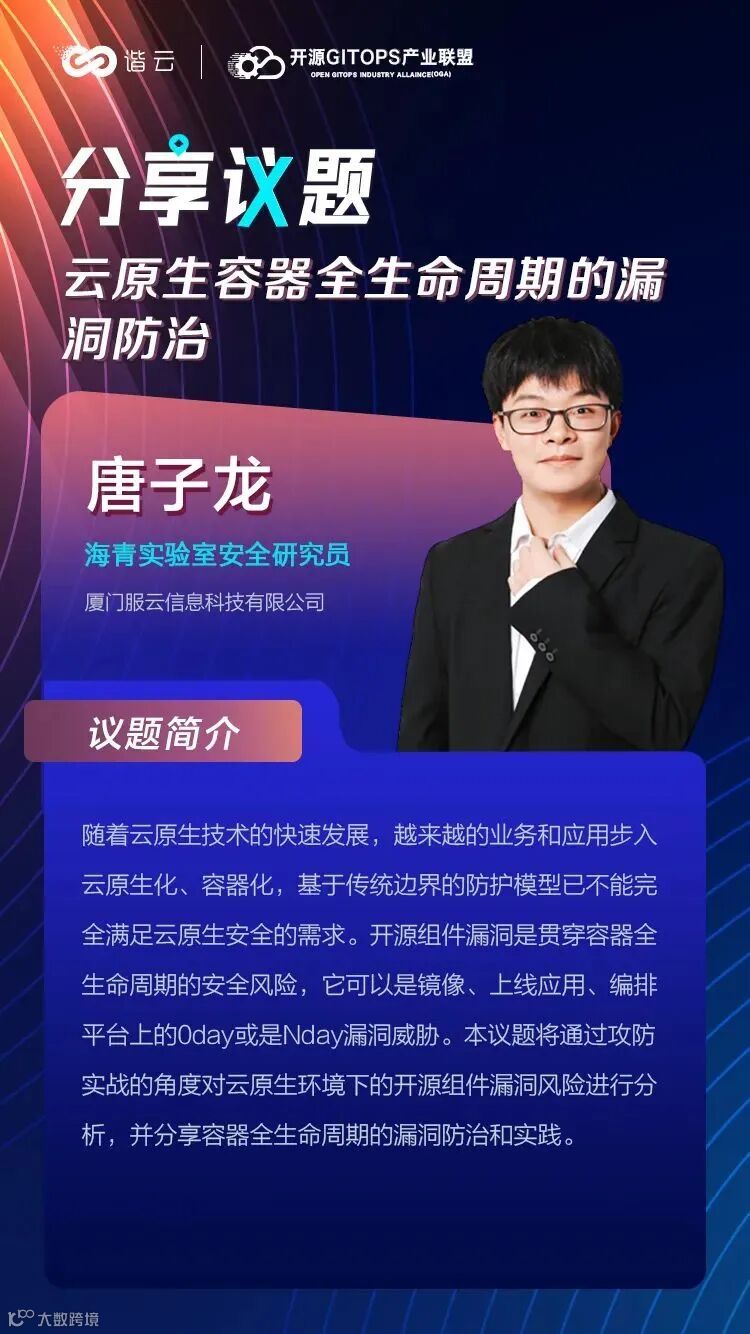 安全狗海青实验室安全研究员唐子龙此次在活动上结合自身的安全研究经验为大家分享了“云原生容器全生命周期的漏洞防治”主题演讲。