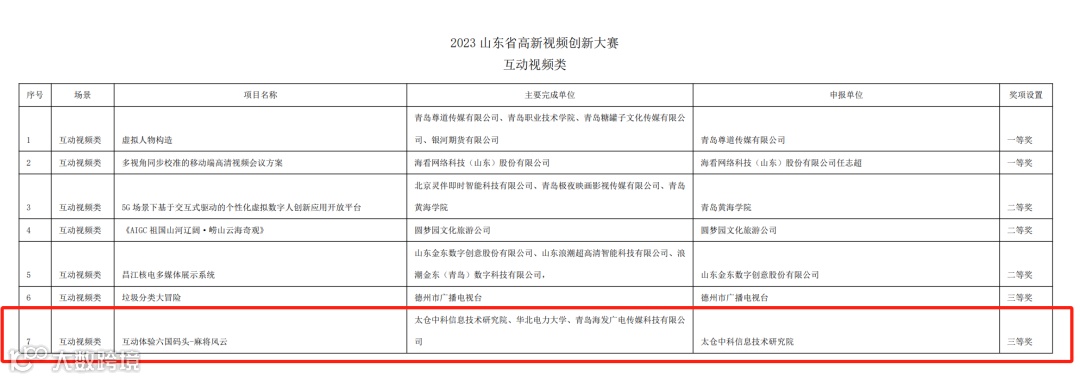 近日,山东省视听高新技术产业发展系列活动在济南举行。活动现场公布了2023山东省高新视频创新大赛获奖结果,该赛征集了沉浸式视频类、VR视频类、互动视频类内容及场景创新创意类、视觉智能类、影视科技类共6个场景类别中的1000余件作品,其中,共117个项目入选创新项目(一、二、三等奖),我院《基于双目视觉的影视 AR 拍摄系统研发》、《影视制作工业化生产技术平台》、《寻梦六国码头百戏之祖-昆曲》、和《互动体验六国码头-麻将风云》分别斩获沉浸式视频类一等奖、影视科技类一等奖、内容及场景创新创意类一等奖、以及互动视频类三等奖。