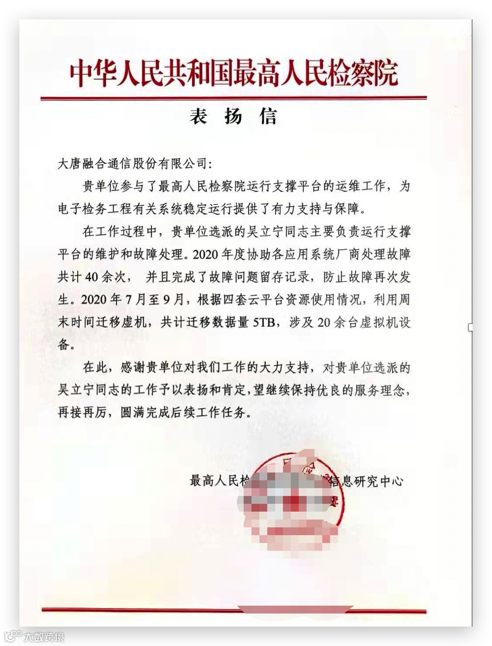 最高人民检察院技术信息研究中心对大唐融合技术人员给予表扬和肯定。