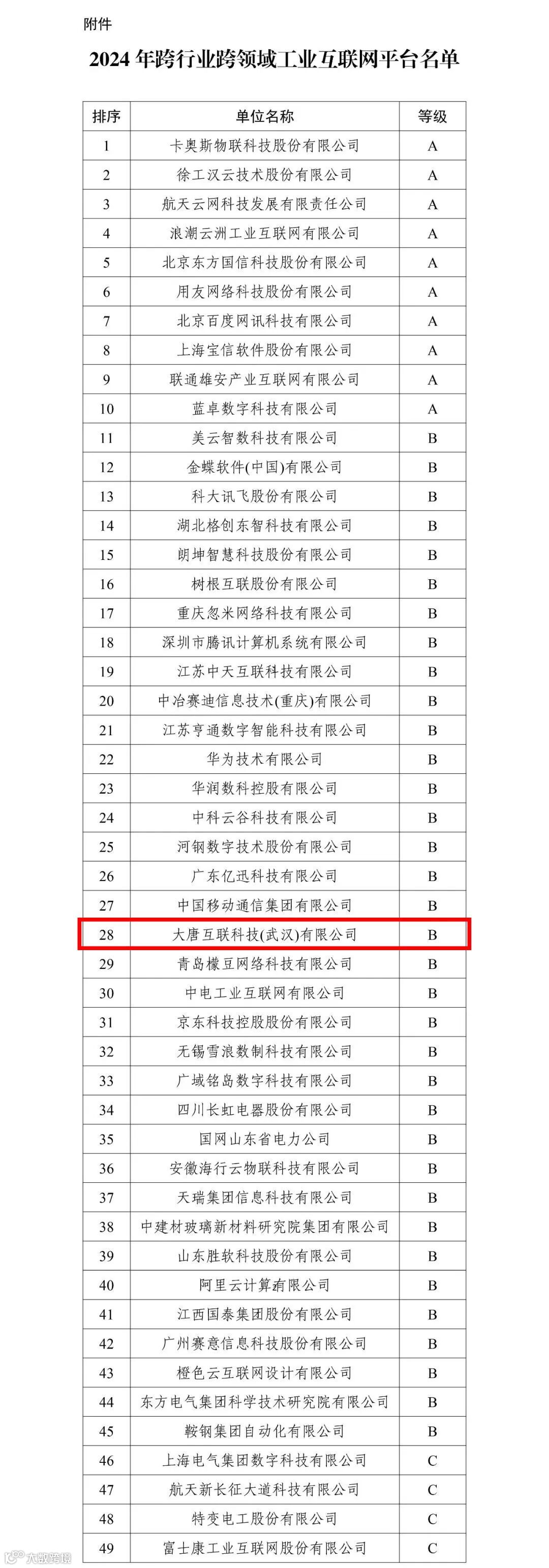 2024年10月30日,工信部公示了“2024年跨行业跨领域工业互联网平台动态评价结果”。此次公示中, 49家入围企业划分为A、B、C三个等级,其中A级企业10家、B级企业35家、C级企业4家。值得关注的是,这是自2019年工信部公布 “双跨”平台以来,首次为“双跨”平台进行分级。中国电子院旗下国投融合DTiip工业互联网平台在此次动态评价结果中表现出色,入选B类企业,排名从2023年第40位跃升至今年第28位,排名上升12位,充分展示了其平台技术水平的提升和业界的广泛认可。
