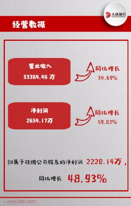 据公开资料显示:大唐融合2015年7月30日挂牌新三板,主要从事信息管理系统整体解决方案、技术开发服务和运营服务,属于创新层企业。报告期内公司营收增长主要公司广电运营支撑系统进一步细分,更加灵活地满足用户需求,此外公司基地公司数量扩大营收规模扩大,“互联网+智能制造”板块实现预期营收;净利润增长是因为公司营业利润同比大幅增长,同时通过进一步挖掘自主研发产品,开拓三大业务板块增量市场,提高产品竞争力。
