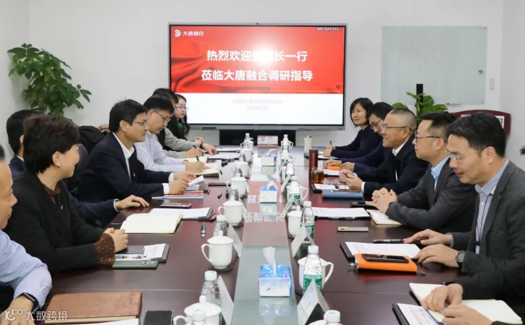 在公司领导班子成员的带领下,娄宇董事长一行视察了公司办公环境,向在场员工致以亲切的问候。在座谈交流会上,大唐融合董事长孙绍利首先对娄宇董事长一行的莅临表示衷心的欢迎与感谢,随后他从大唐融合基本情况、历史沿革、业务规划、2023经营情况以及2024年重点工作等方面进行了详细汇报。