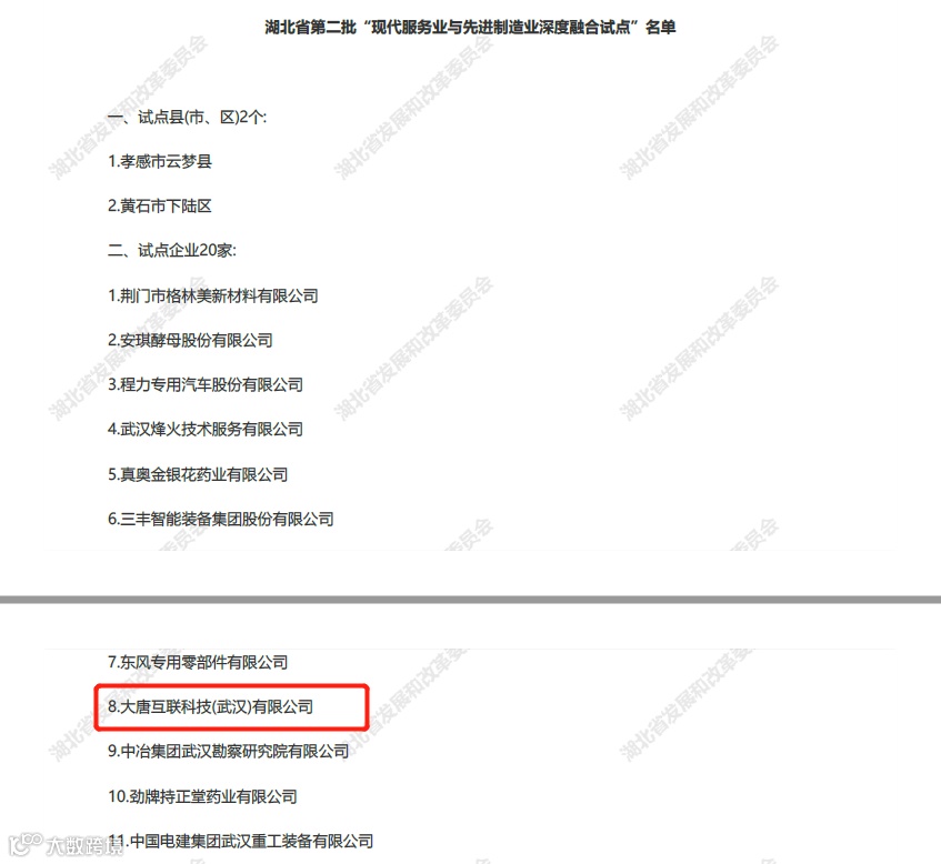 近日,湖北省发展和改革委员会公示湖北省第二批“现代服务业与先进制造业深度融合试点”名单,大唐融合旗下子公司大唐互联科技(武汉)有限公司经过专家评审顺利入围。