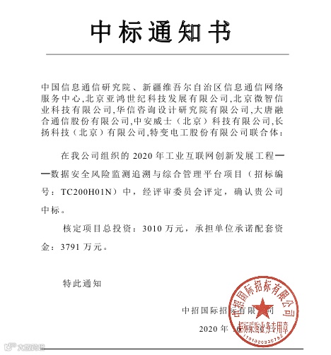 经过数月评选,近期工信部对“2020年工业互联网创新发展工程项目”中标结果进行了公示。大唐融合及其他相关单位在信通院的牵头下,凭借综合技术实力脱颖而出,成功中标2020年工业互联网创新发展工程项目-数据安全风险监测追溯与综合管理平台项目。