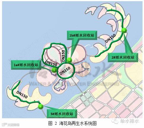 再生水管网沿岛内主干道敷设干管,干管管径均为DN150,沿途为周边地块输送再生水。其余支管管径为DN100~125,其中纬十路段再生水敷设于管廊内。再生水系统具体布置如图2所示。
