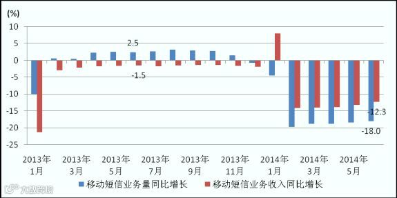 图6. 2013-2014年各月移动短信业务量和移动短信收入同比增长情况
