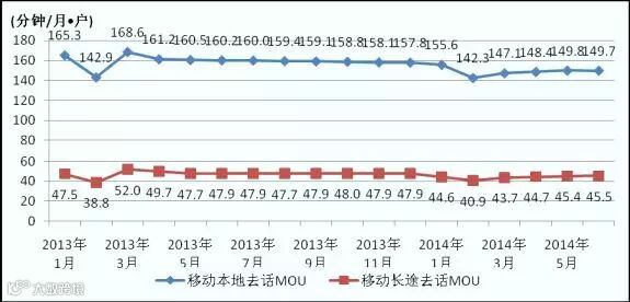 移动话音业务量增速不足移动电话用户增速的三分之一。在“一户多卡”用户的增多,以及互联网应用对话音业务的替代双重作用下,移动话音业务增长进一步趋缓。1-6月,全国移动电话去话通话时长14598.7亿分钟,同比增长2.2%,比上年同期下降3.4个百分点。其中,移动本地和移动长途分别为11193.9、3404.8亿分钟,同比增长1.8%和3.5%,分别比上年同期增速低3.8、2.4个百分点。移动语音业务量和用户增长呈现显著失衡状态,移动电话通话时长的增速仅为移动电话用户增速的三分之一,每用户每月贡献的移动语音业务量同比持续下降。移动本地去话MOU为149.7分钟/月·户,移动长途去话MOU为45.5分钟/月·户,同比分别下降6.6%、5%。