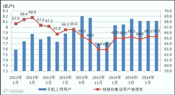 图4 2013-2014年各月手机上网用户和对移动电话用户渗透率情况