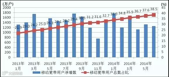 图2.2013-2014年移动宽带用户当月净增数和占比情况