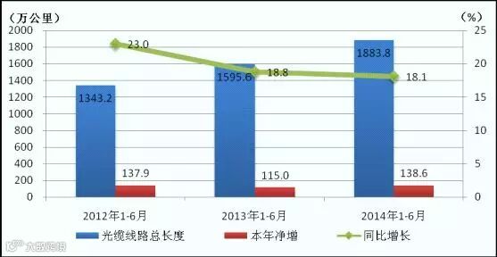图12 2012-2014年1-6月光缆线路总长度发展情况