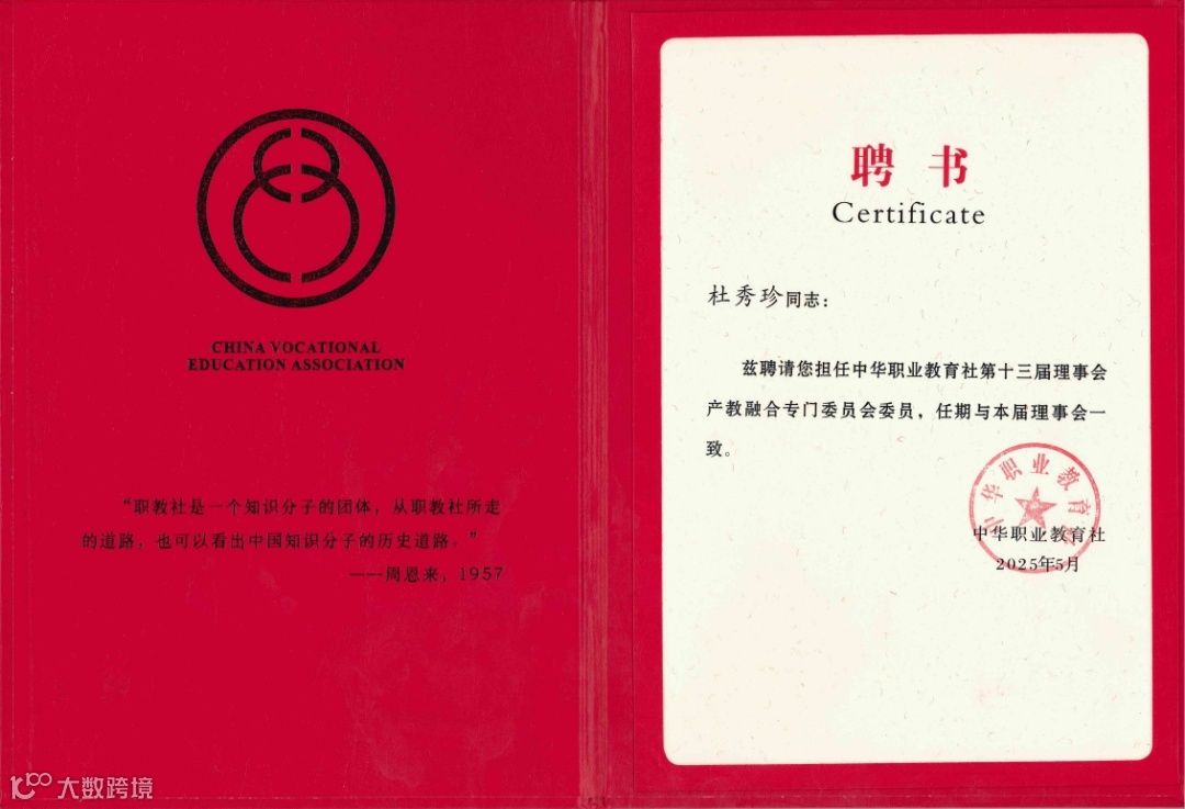 会议现场,集团董事长杜秀珍获聘中华职业教育社第十三届理事会“产教融合专门委员会委员”,全国政协副主席、中华职业教育社副理事长秦博勇亲自为其颁发聘书,充分肯定董事长杜秀珍及新龙科技集团在推动产教融合、校企协同领域的突出贡献。