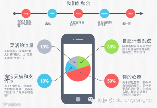 拿阿里通信举例,从消费者角度来说,他们可在淘宝和天猫平台上进行在线选号入网、充值缴费、加入阿里合约计划;从阿里通信的角度来说,他们可以整合其他阿里系的服务,例如打通支付宝、淘宝、天猫、聚划算等账户,并通过创新数据业务来提供比传统电信运营商更加多元的增值服务。