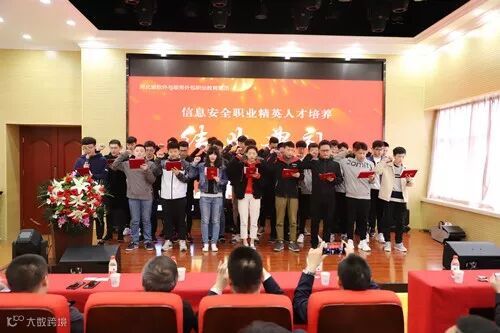 典礼最后,27名参加培训的学员从国家计算机网络应急协调中心河北分中心主任 陈皖松、360企业安全集团河北办事处行业部总经理 何锋、河北省软件与服务外包职业教育集团产教融合研究院执行院长 刘军池三人手中拿到了他们期盼已久的培训证书。27名学员还郑重宣誓,大家表示今后将遵守国家有关法律、法规规定和相关保密要求,保证不使用任何手段从事危害网络运行的黑客行为,不侵犯国家、社会、集体利益和第三方的合法权益,做一名合格的网络信息安全卫士。