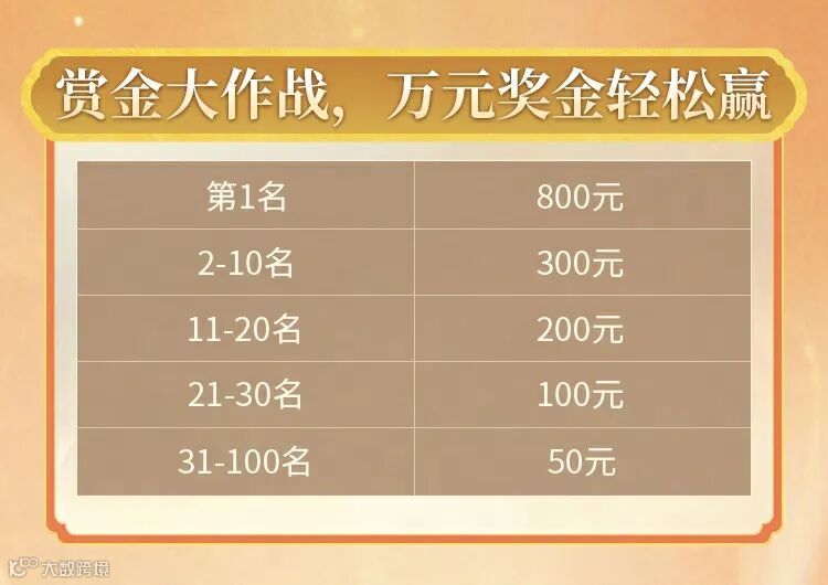 最关键的是,1月27日晚20:00-21:30的赏金大作战,官方直接设置了两万元赏金作为单场活动奖励,豪气满满。各位少侠只需加入任一阵营,锁定敌对阵营首领展开猛烈追杀,即有极大机会成为万元赏金的瓜分者。烽火熄灭时,双方排行榜Top100的侠士将依据所获名次瓜分万元现金,榜一大哥的赏金高达800元。