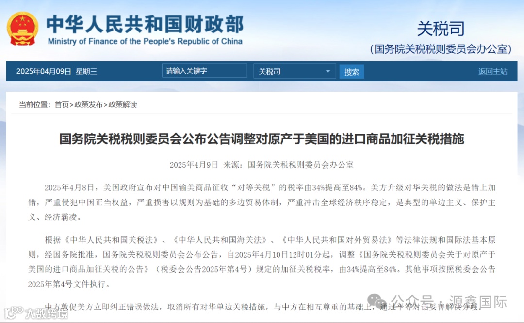 一、调整《国务院关税税则委员会关于对原产于美国的进口商品加征关税的公告》(税委会公告2025年第4号)规定的加征关税税率,由34%提高至84%。