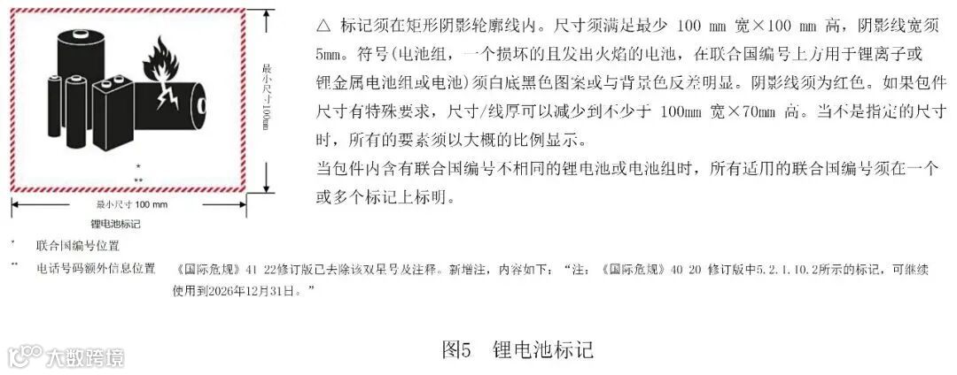2. 除集装箱式锂离子电池储能系统及以锂电池驱动(纯电或混动)的车辆以外,装有锂电池或锂电池组的包件应按要求张贴如图4所示的9A危险货物标志或如图5所示的锂电池标记。张贴要求见附件1。