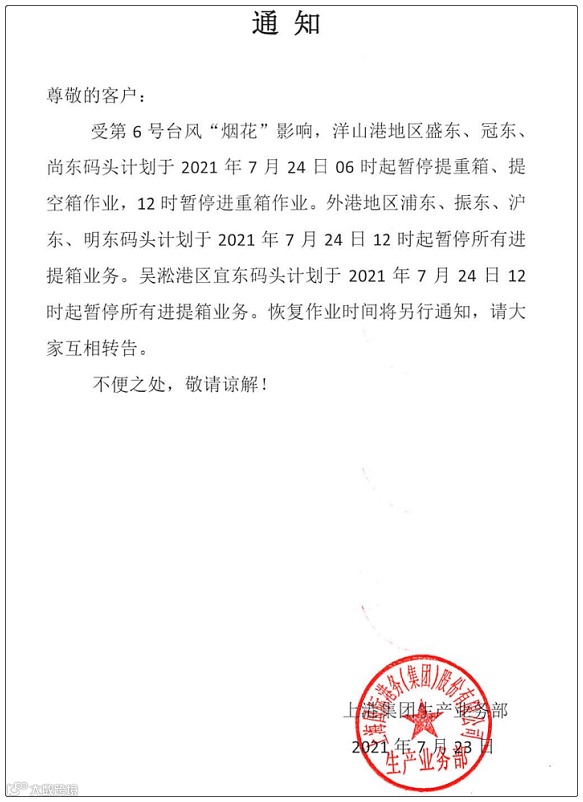 受第6号台风“烟花”影响,洋山港地区盛东、冠东、尚东码头计划于2021年7月24日06时起暂停提重箱、提空箱作业,12时暂停进重箱作业。