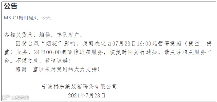 宁波多个码头已给各相关船公司、货代及车队发布相关通知。