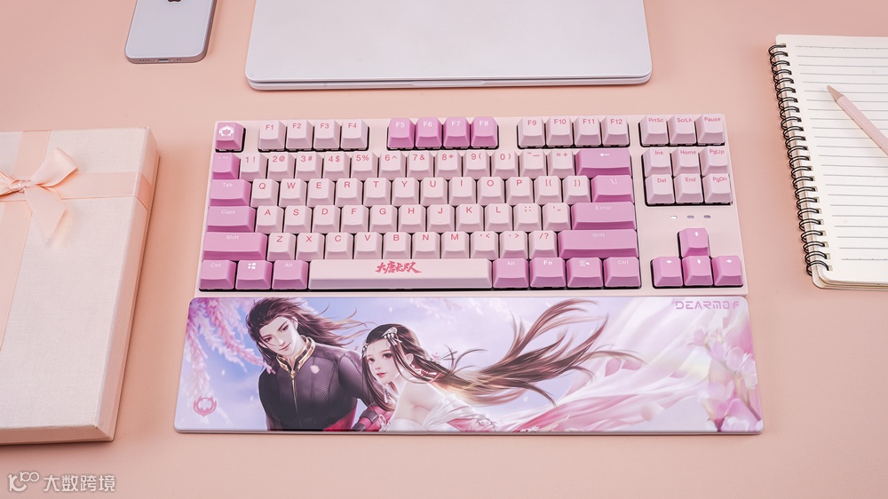 风流倜傥战群王 乱世精灵医术强,诠释了男无名和百花医女的特点,迪摩巧妙的将大唐无双最唯美的两个角色融合在F87三模无线键盘上,键盘整体以粉色为主,采用2.4G/蓝牙5.0/有线三种连接模式,全键可通过驱动实现自定义功能,1680万色RGB灯效在角色主推的衬托下,键盘整体颜值瞬间提高不少。