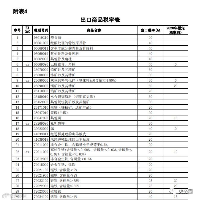 自2020年1月1日起继续对铬铁等107项商品征收出口关税,适用出口税率或出口暂定税率,征收商品范围和税率维持不变(见附表4)。