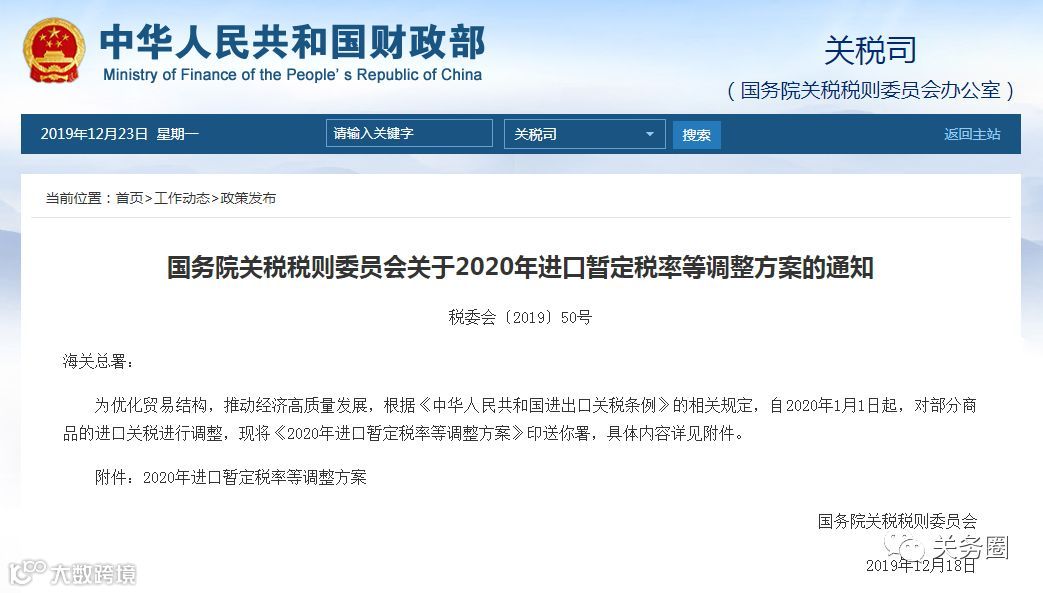 2020年进口暂定税率等调整方案的通知