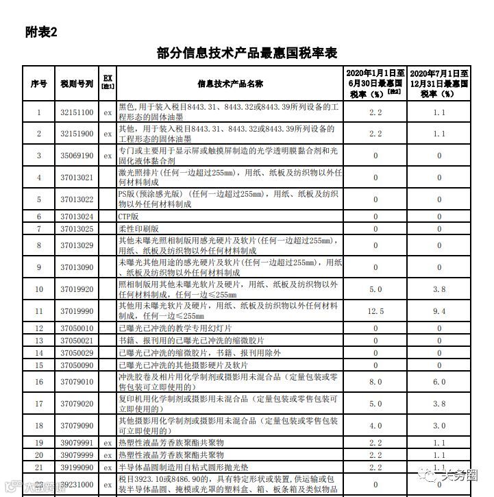 2.对《中华人民共和国加入世界贸易组织关税减让表修正案》附表所列信息技术产品最惠国税率自2020年7月1日起实施第五步降税(见附表2)。