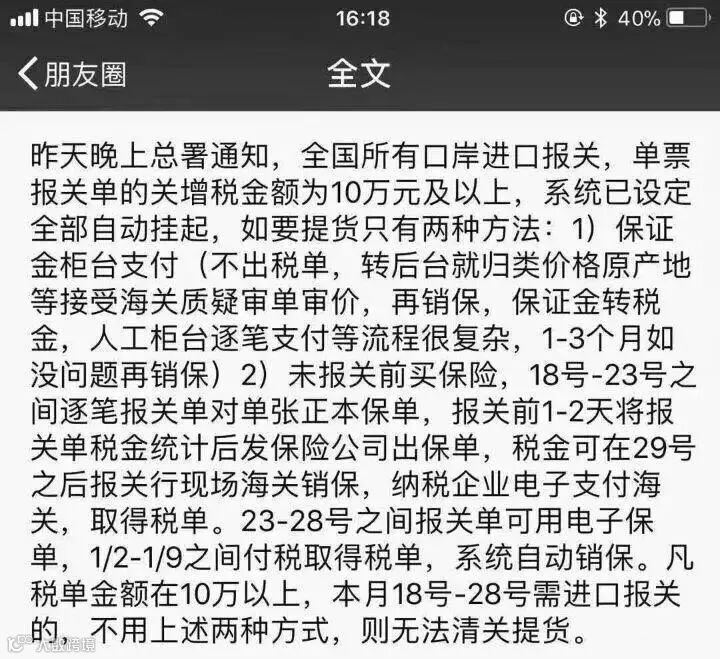 12月18日,关务圈都在传“税款超过10万的报关单,会转保证金做放行”的通知,通知中说:超10万的单证将会直接进去审单中心磋商,由审单中心以保证金形式审结,再发联系单到现场海关,通知企业缴纳保证金后才放行。