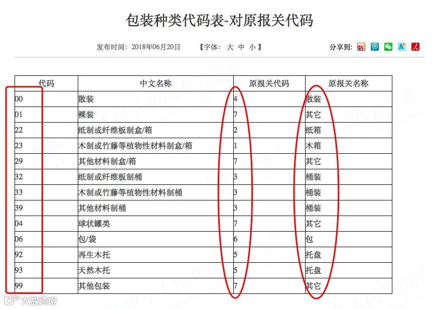 【包装种类代码表】左侧方框为新代码,右侧为原代码(8月1日后停止使用)