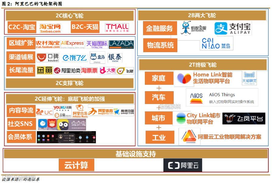 核心在于提供基础设施。主要是指阿里云计算。这是对企业内部各项业务进行技术赋能的业务,是飞轮快速转动之后衍生出的新一层飞轮,带动飞轮高速旋转。无论是淘宝天猫的购物数据、还是菜鸟物流的运输网络都需要数据处理的强大支撑,作为第四层飞轮的云计算成为前三大飞轮正常运转的有利支撑。