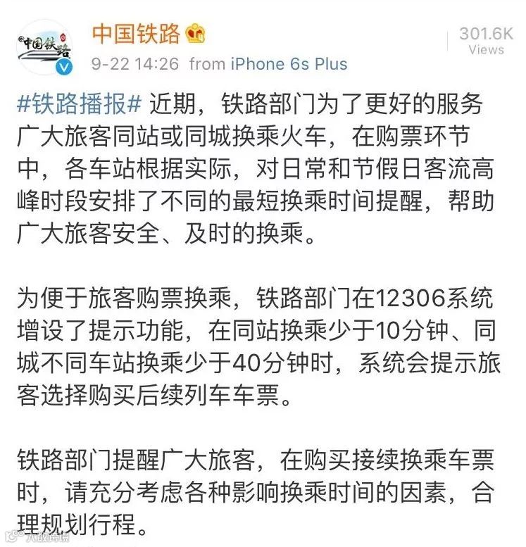 记者从中国铁路客户服务中心12306获悉,9月22日起,通过网络、电话、自动售票机、人工窗口等方法购买同站换乘的车票时,两张车票需间隔10分钟以上;购买不同车站换乘的车票时,两张车票间隔需在40分钟以上,如果购票间隔少于规定时间,系统会弹出出票失败的提示。