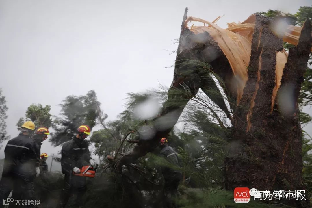 风浪中,消防员们拿着锯子,不停地锯着道路上的树木和枝干。