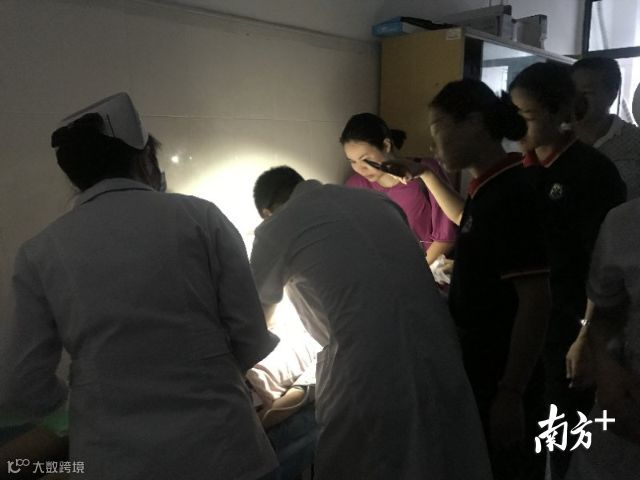 医护人员只能围成一圈,一边帮忙打着手机照明,一边紧急处理着患者伤口。