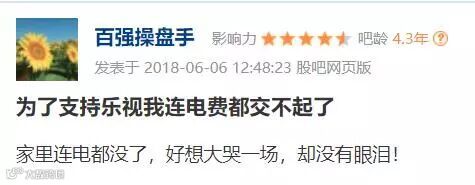 连ID为“百强操盘手”的网友都在股吧哭诉,为了支持乐视,“连电费都交不起了”……