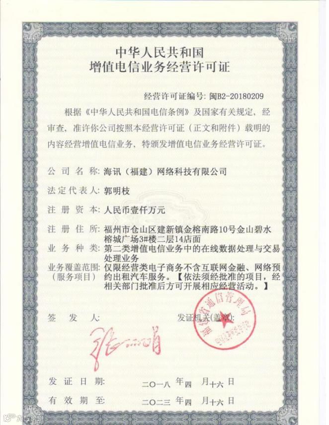 《中华人民共和国增值电信业务经营许可证》的获得,标志着海讯网络科技公司的品牌信誉在业界将得到更加普遍的认可。同时获得了国家及地方政府的支持,公司提供的互联网增值业务更能得到国家的政策和法律的保护。