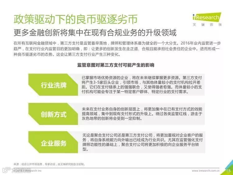 政策驱动下的良币驱逐劣币:更多金融创新将集中在现有合规业务的升级领域。随着监管进一步趋严,在支付行业内监管目的更加明确,即:让更多创新发生在走正道、合规且能承担社会责任的企业中。