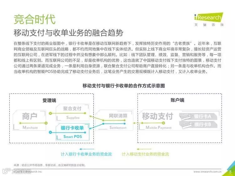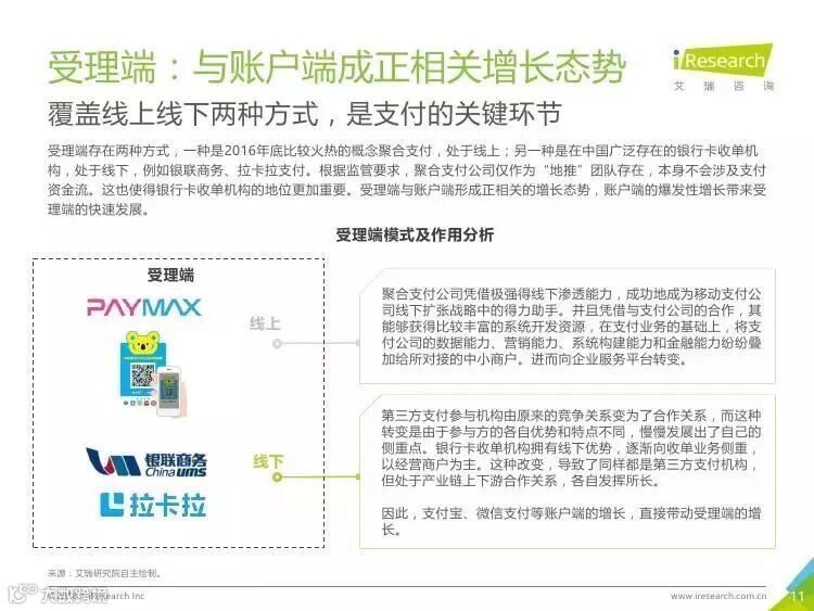 受理端:与账户端成正相关增长态势。覆盖线上线下两种方式,是支付的关键环节。根据监管要求,聚合支付公司仅作为“地推”团队存在,本身不会涉及支付资金流。这也使得银行卡收单机构的地位更加重要。