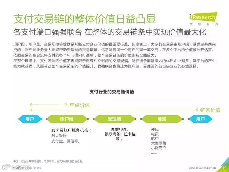 1、行业洗牌:已掌握市场优势资源的企业,将在未来继续掌握更多资源,第三方支付将产生3-5家巨头企业,引领市场,与其他体量较小的支付机构拉开差距。它们在支付链条上的强强联合,又使得强者愈强。而体量较小的支付机构可能会专注于某一特定客户群体,特定行业的支付需求。