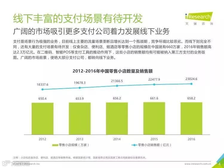 线下支付依旧是主战场:2016年,中国居民最终消费支付超过29.2万亿人民币,作为全球最好的消费市场,有大量的民间交易未被记录在内,这些民间交易大部分属于线下交易,随着支付新业态的成熟,未来这些尚未被记录的交易均会成为第三方支付的目标市场,未来发展空间广阔。
