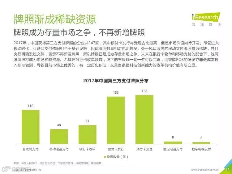近日,艾瑞咨询发布了《2018年中国第三方支付商业职能变革研究报告》。根据报告内容,2018年线下支付依旧是主战场,第三方支付行业将进入洗牌期,将产生3-5家巨头企业,绕过各类监管红线,游走于灰色地带的创新将会受到一定抑制。聚合支付公司将更加积极的向企业服务平台转型。