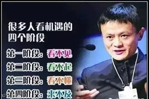 马云养猪,告诉我们:任何一次商机的到来,都必将经历四个阶段:“看不见“、“看不起“、“看不懂”、“来不及”。先知先觉经营者,后知后觉跟随者,不知不觉消费者 !