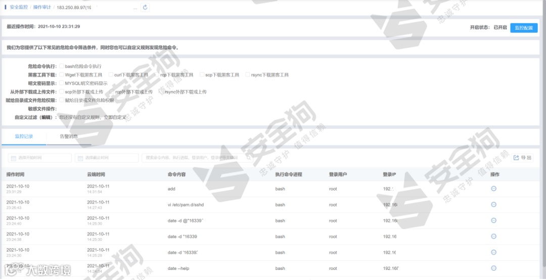 通过云眼-安全监控-登录监控/操作审计,可监控操作系统上所有账户登录行为与重要操作行为,云眼支持自定义重要行为。