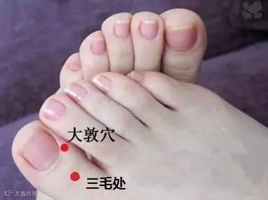 三毛穴:搓揉脚趾,特别是大脚趾头第二节的几根汗毛的地方,叫“三毛穴”,要多揉搓,然后稍用力捏3~5下。