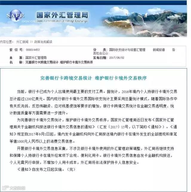 重磅突发!银行卡在境外单笔交易1000元以上需要报备《国家外汇管理局关于金融机构报送银行卡境外交易信息的通知》原文!