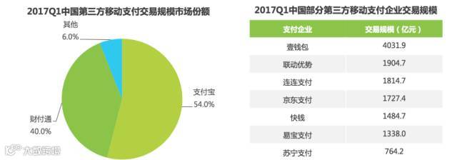 第三方研究机构艾瑞(iResearch)公布的数据显示,2017年第一季度中国第三方移动支付交易市场中,支付宝市场份额同比增长2.2%至54%。紧随其后的腾讯旗下财付通(含微信支付),交易市场份额同比增长1.7%至40%。