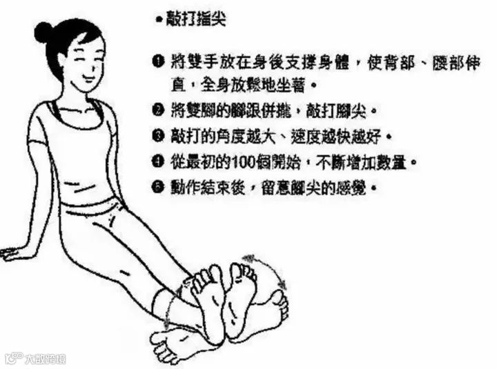 只要伸直双腿,将脚后跟靠在一起,用双脚的大拇指相互碰撞,一分钟大约做上100次即可。